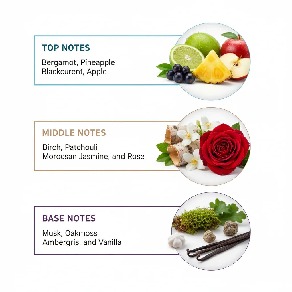 Notes: Top: Bergamot, Pineapple, Apple | Heart: Birch, Jasmine, Patchouli | Base: Musk, Oakmoss, Vanilla