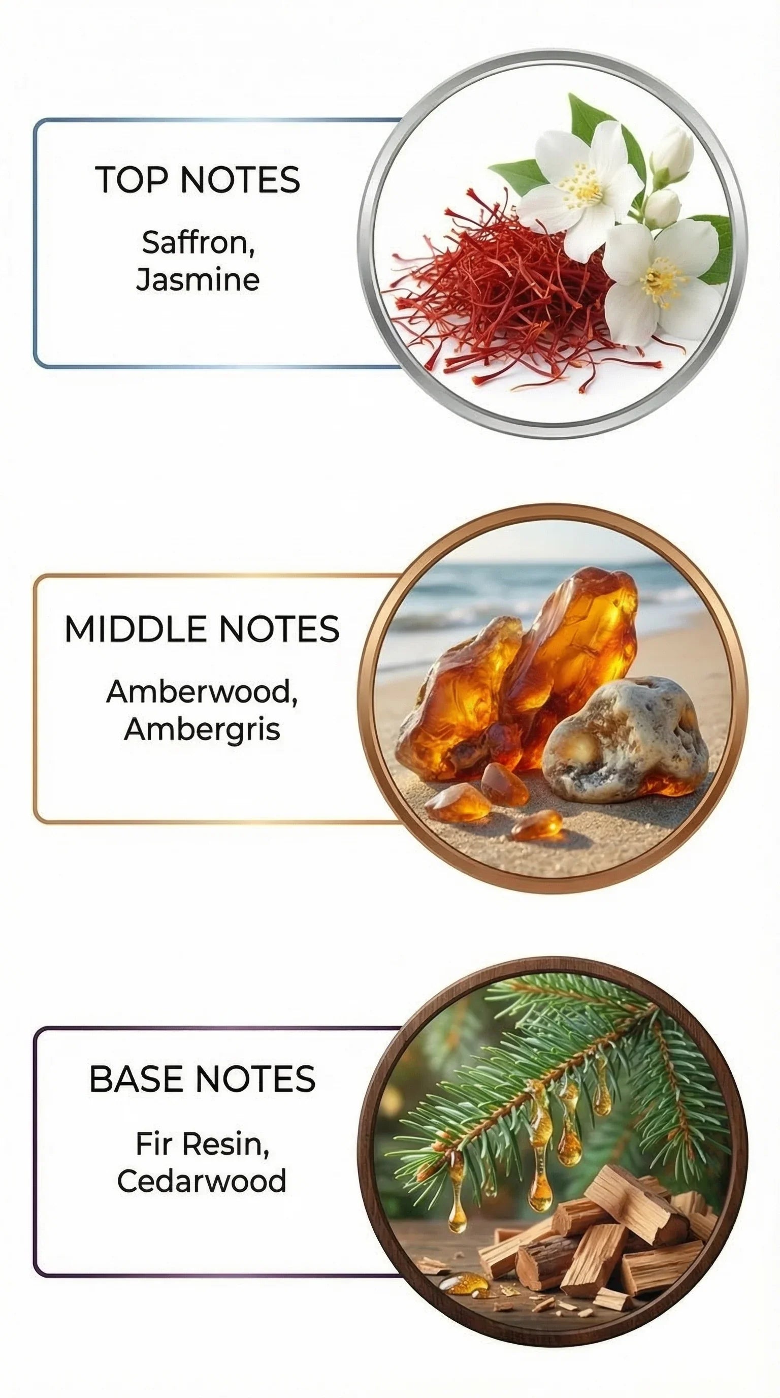 Scent Accords: Sweet Amber, Woody Warm, Airy Floral, Resinous Smoothness